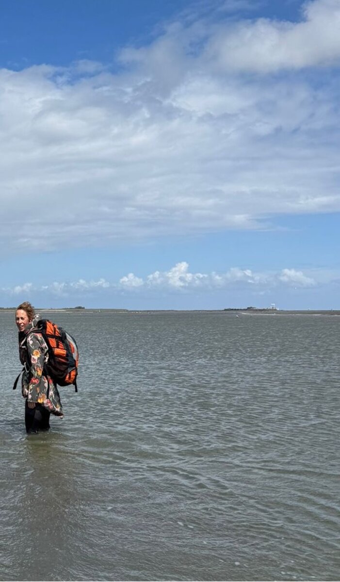 “To know the way, you go the way”, een citaat van de enige echte filosofische teddybeer mij bekend: Winnie the Pooh, bleek veel waarde te hebben. Want de route die we zouden nemen was door het hoge water niet altijd mogelijk, we meanderden, liepen vol vertrouwen achter Jan aan, gleden uit, werden tot onze kruin nat, en ploeterden door. Ik herinner me nog goed het moment van huiver, we waren toch al reeds 5 uur op weg, toen Jan zei: “goh gisteren stond het water op dit tijdstip toch wel een flink stuk lager, en we moeten nog door de geul”. Hij duidde met zijn hand dat het bij hem gisteren tot aan zijn middel kwam. Nu is het wel handig om iets over het postuur van Jan te weten, het is een boomlange vent van ik schat krap 2 meter. De gemiddelde lengte van ons als deelnemers lag op zo’n 1 meter 70. Je snapt dat ik het toen een beetje benauwd kreeg. We hadden nog wel een uurtje te gaan dacht Jan zo. En toen gebeurde het, een vrouwelijke deelneemster gleed uit, ging kopje onder en bleef vastzitten. Jan moest haar met behulp van een stok uit het slib trekken. En dat was een stuk spannender om te aanschouwen dan ik had gedacht. Ze bleef redelijk rustig, was stoer, én het deed ons allemaal een boel. Ineens was die kabbelende zee en dat soms wat gladde slib gevaarlijk. En de sfeer sloeg om.
